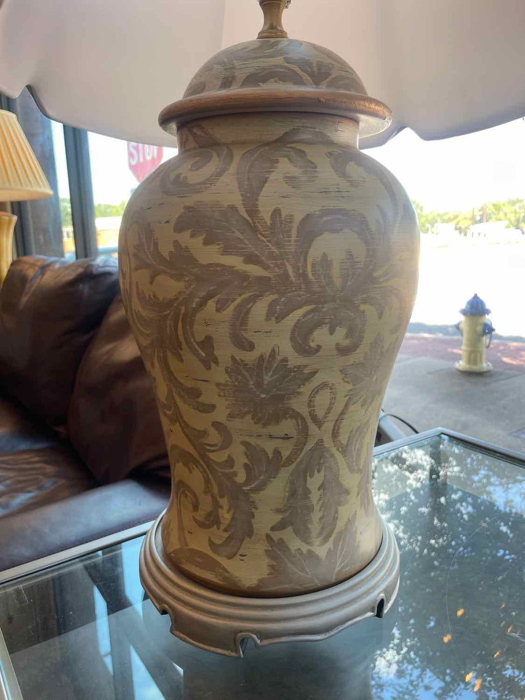 Wildwood Table Lamp w/ Gold Ceramic Base & Beige Shade - 30" Tall