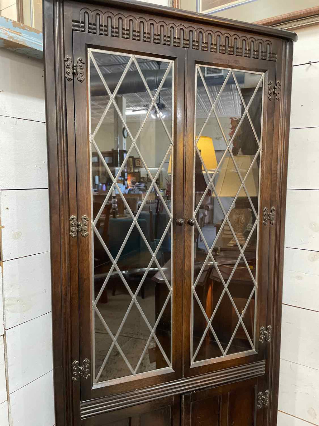 Antique Corner Cabinet w/ 2 Leaded Glass Doors & 2 Wood Doors - 66" Tall x 26.5" Wide x 18.5" Deep
