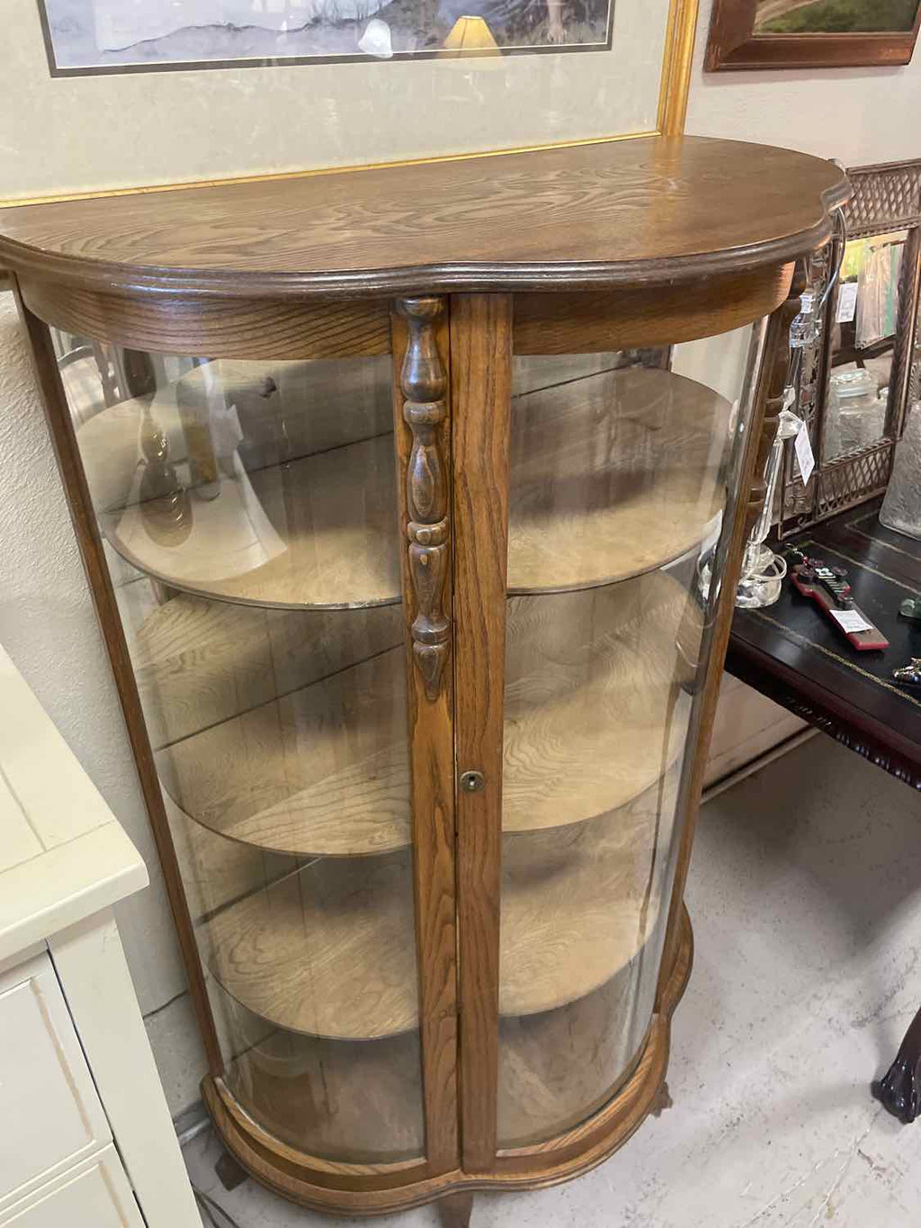 Antique Oak Bowfront Curio w/ 3 Interior Wood Shelves - 57.5" Tall x 34.5" Wide x 18" Deep
