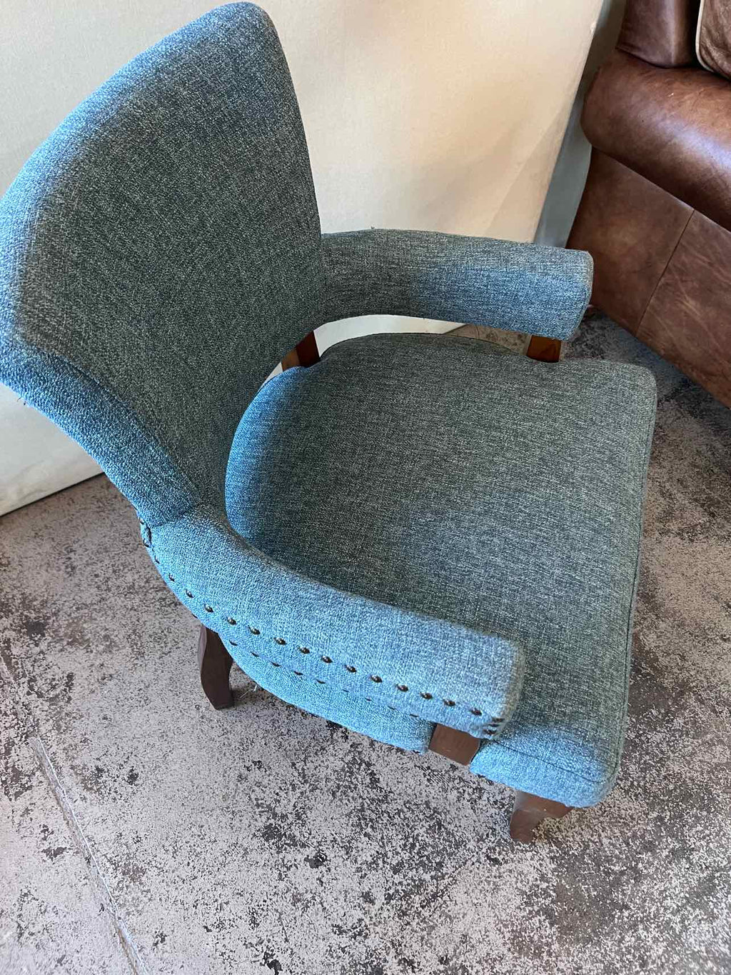 Wood Framed Armchair w/ Blue Upholstery - 35" Tall x 24" Wide x 23" Deep