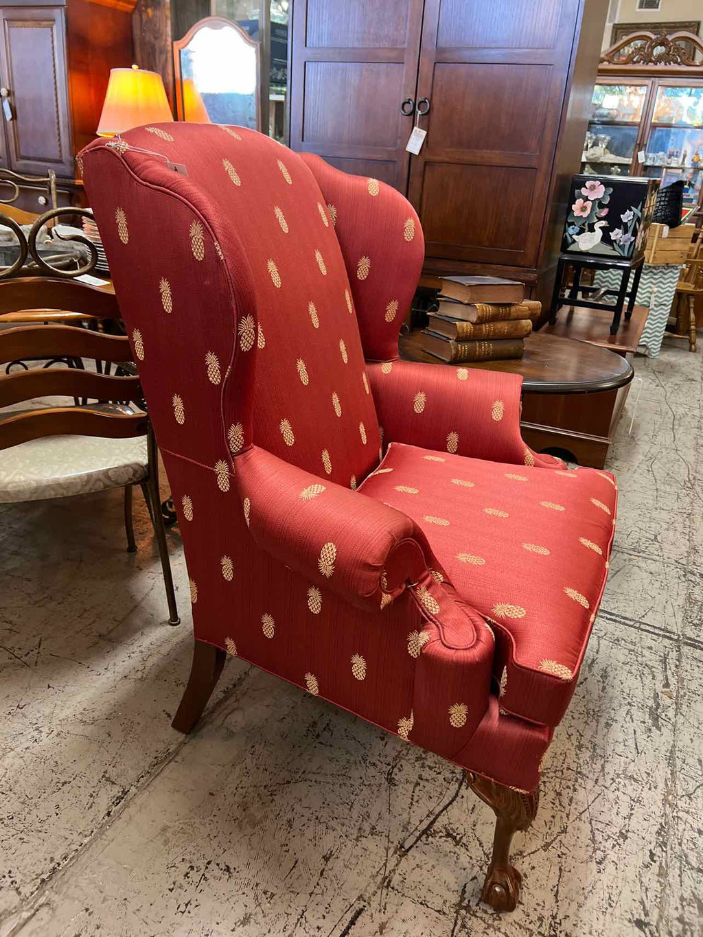 Red Wingback Occasional Chair by Fairfield Furniture w/ Gold Pineapple Upholstery - 45" Tall x 38" Wide x 35" Deep