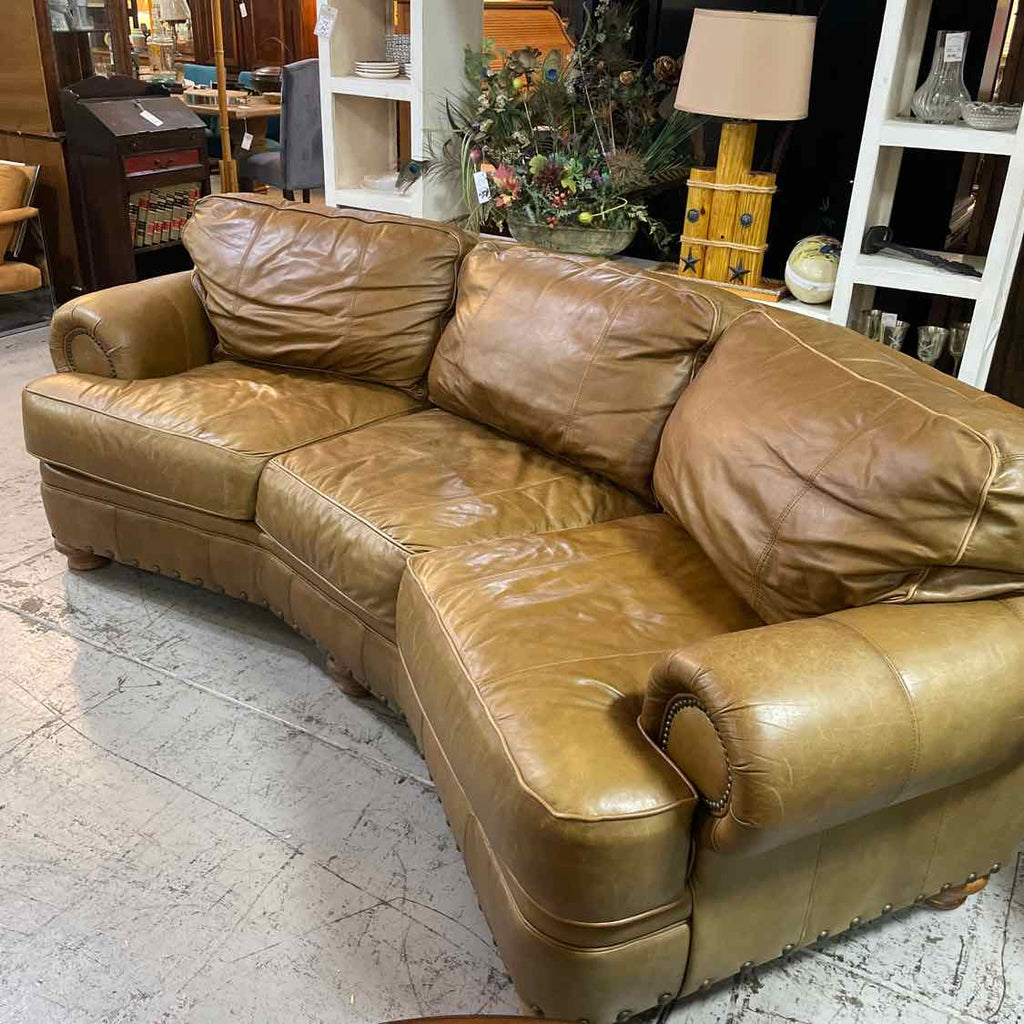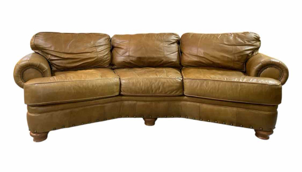 Curved Brown Leather Sofa w/ Nailhead Trim - 32" Tall x 99" Wide x 40" Deep