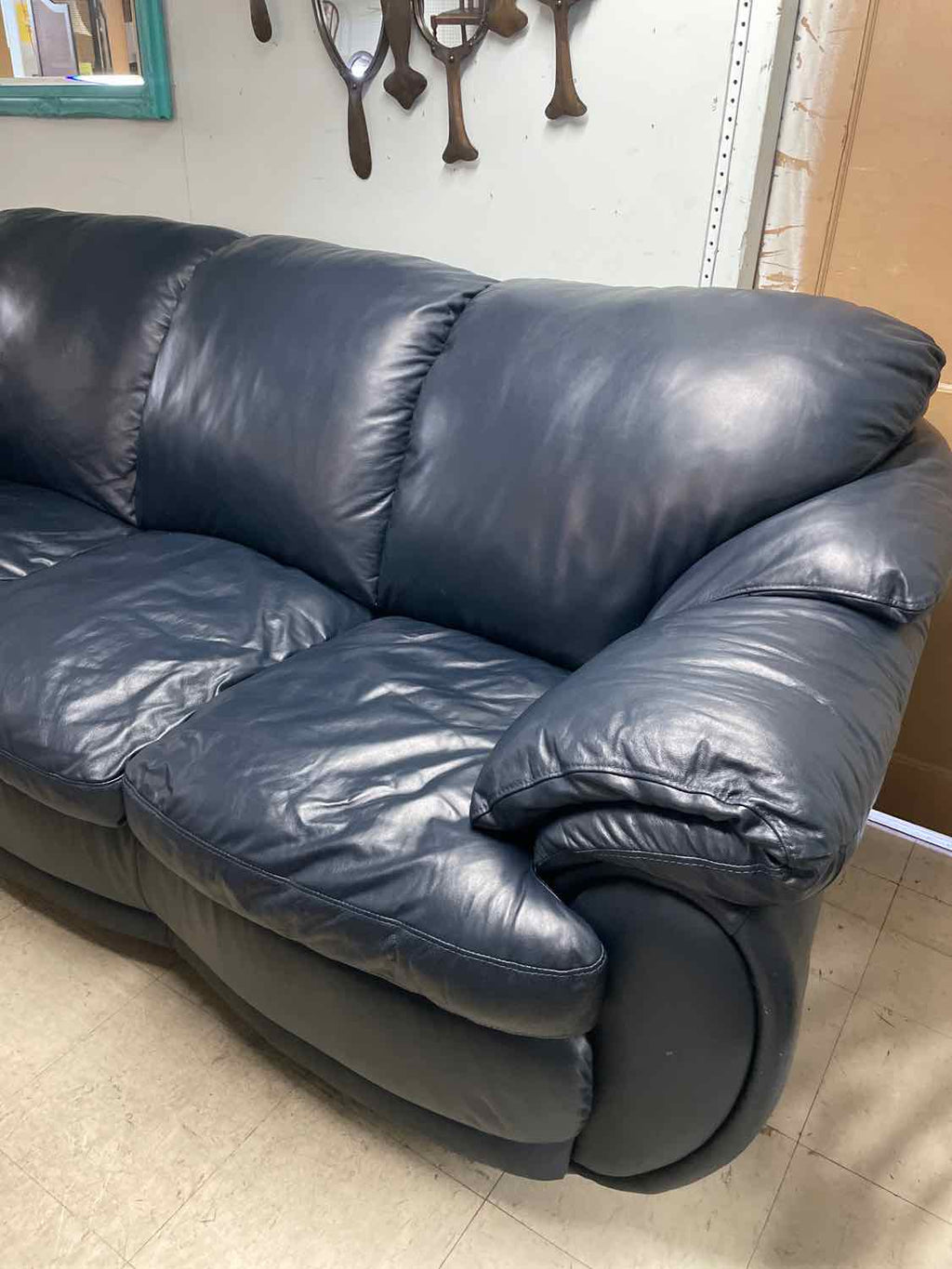 Blue Genuine Leather Overstuffed 3-Cushion Sofa - 38" Tall x 90" Wide x 35" Deep