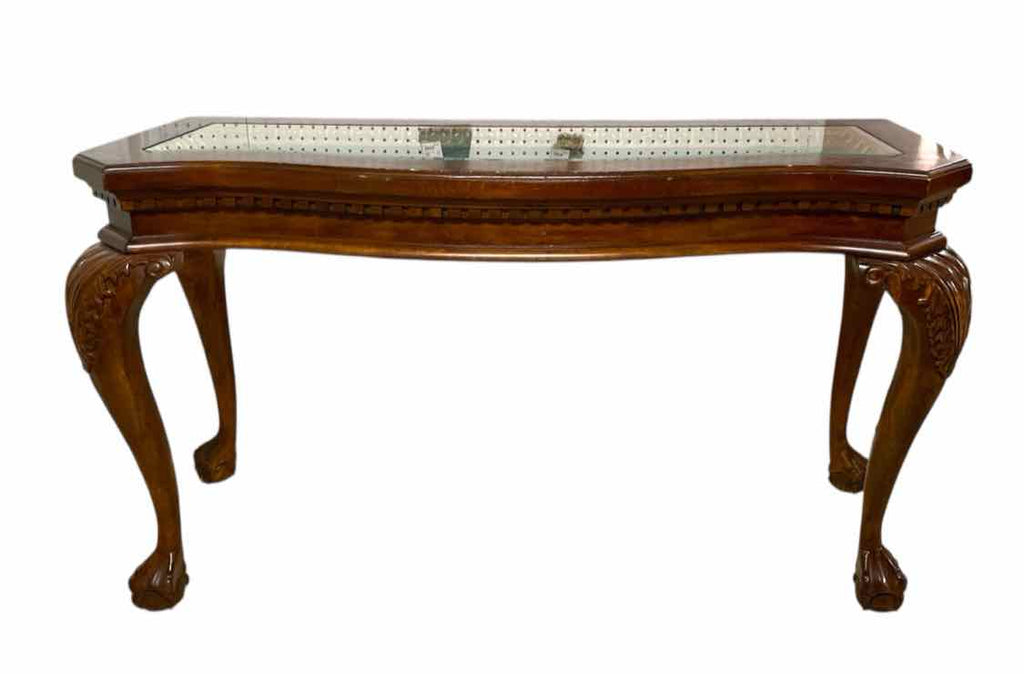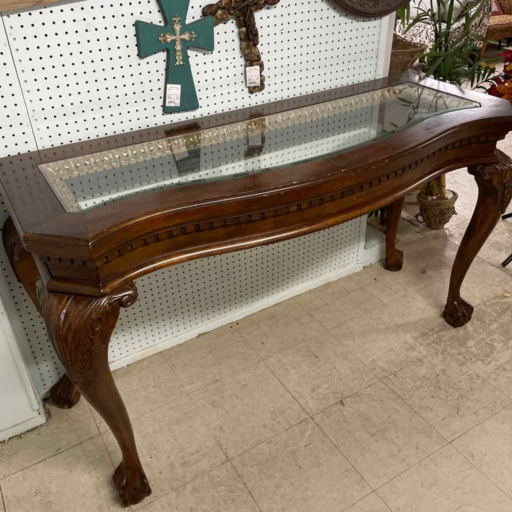 Ornately Carved Sofa Table w/ Beveled Glass Top - Priced for Condition, Glass is Scratched - 34" Tall x 60" Wide x 23" Deep