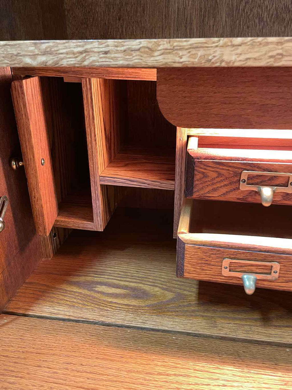 Solid Oak Drop Front Secretary w/ 2 Barrister Style Glass Doors, Light & 1 Filing Drawer - 54" Tall x 34.5" Wide x 15" Deep