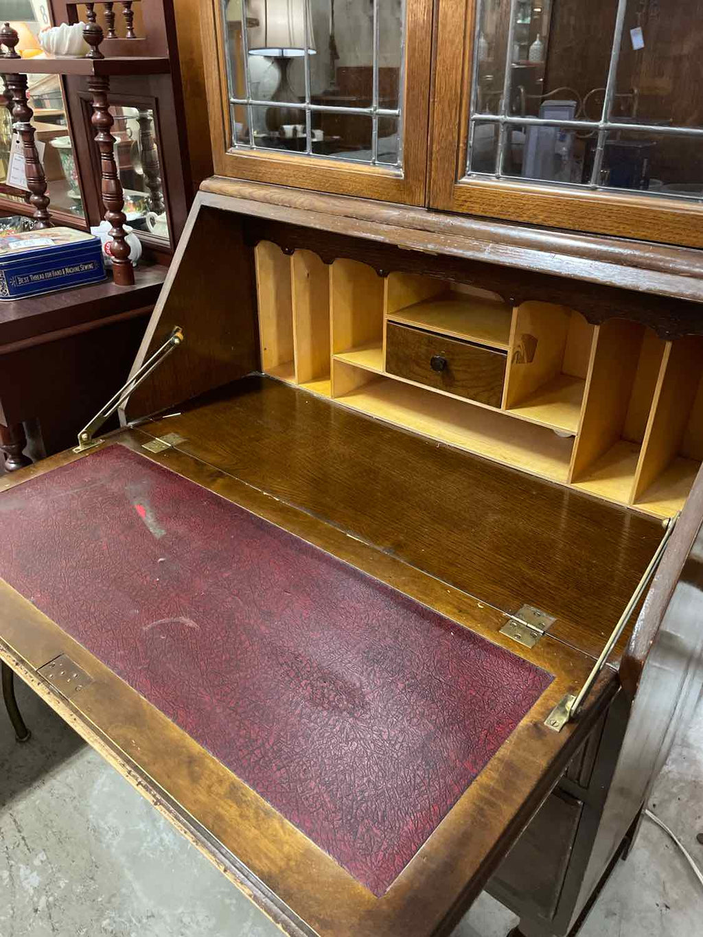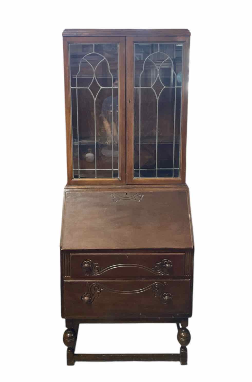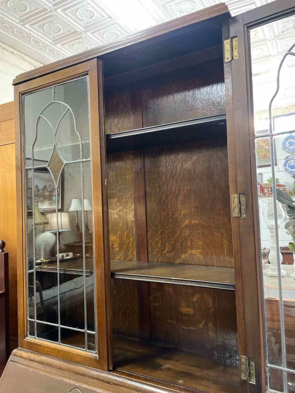 Antique Oak Secretary w/ 2 Leaded Glass Doors, Drop Front & 2 Drawers - 77" Tall x 30" Wide x 17" Deep