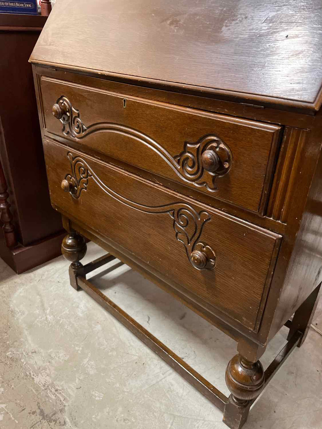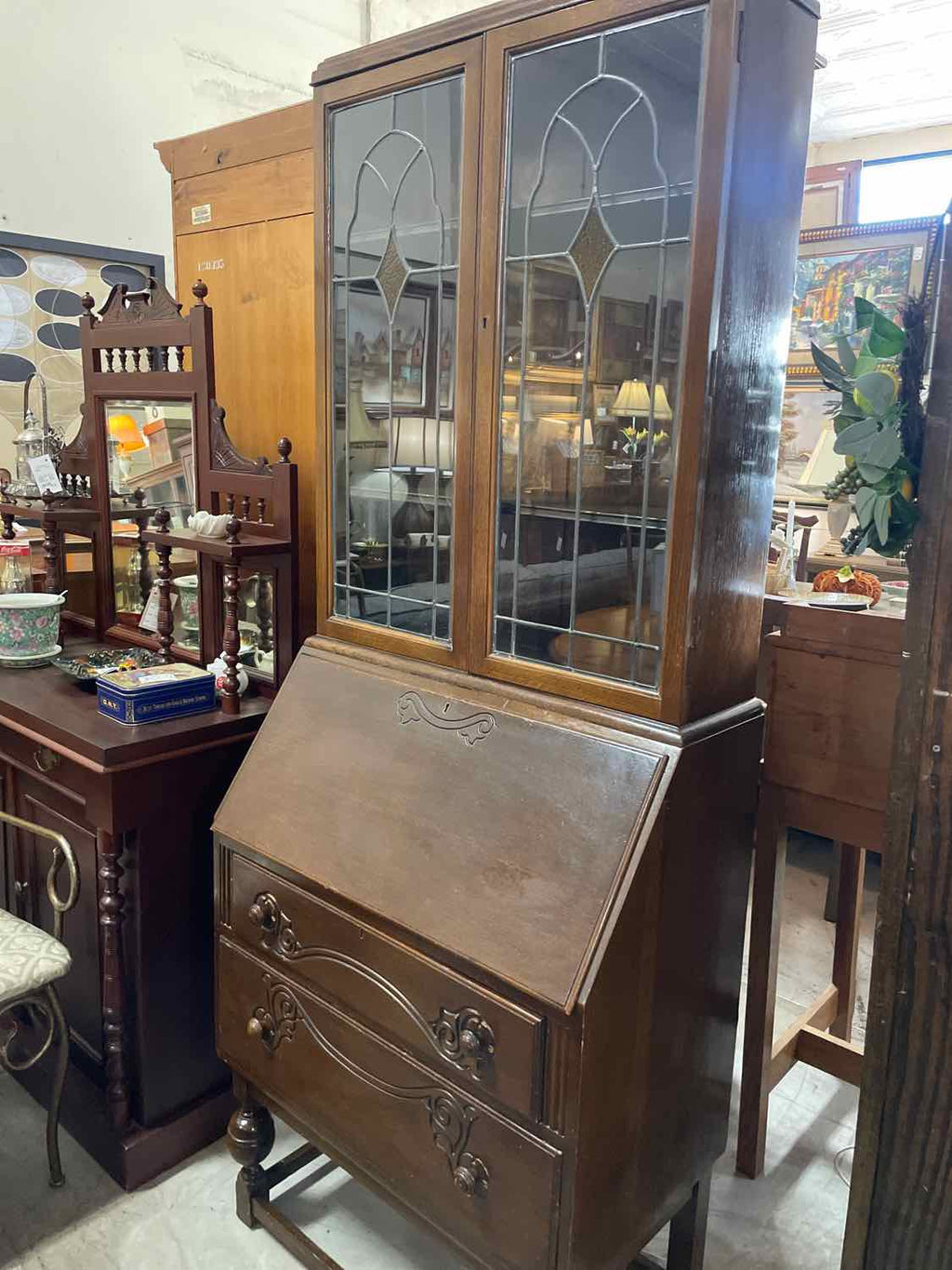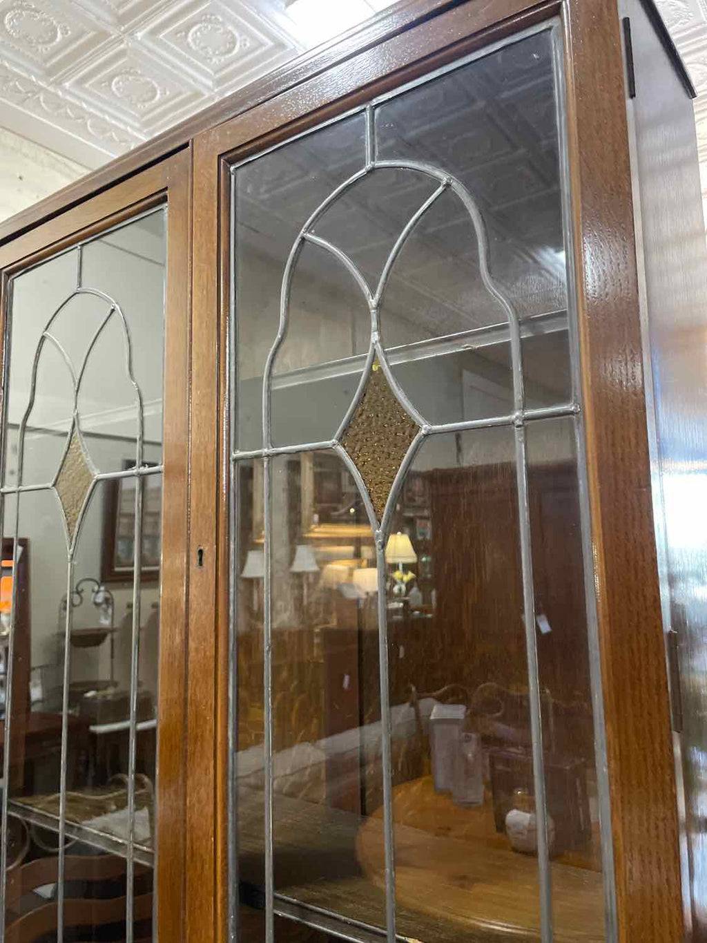 Antique Oak Secretary w/ 2 Leaded Glass Doors, Drop Front & 2 Drawers - 77" Tall x 30" Wide x 17" Deep