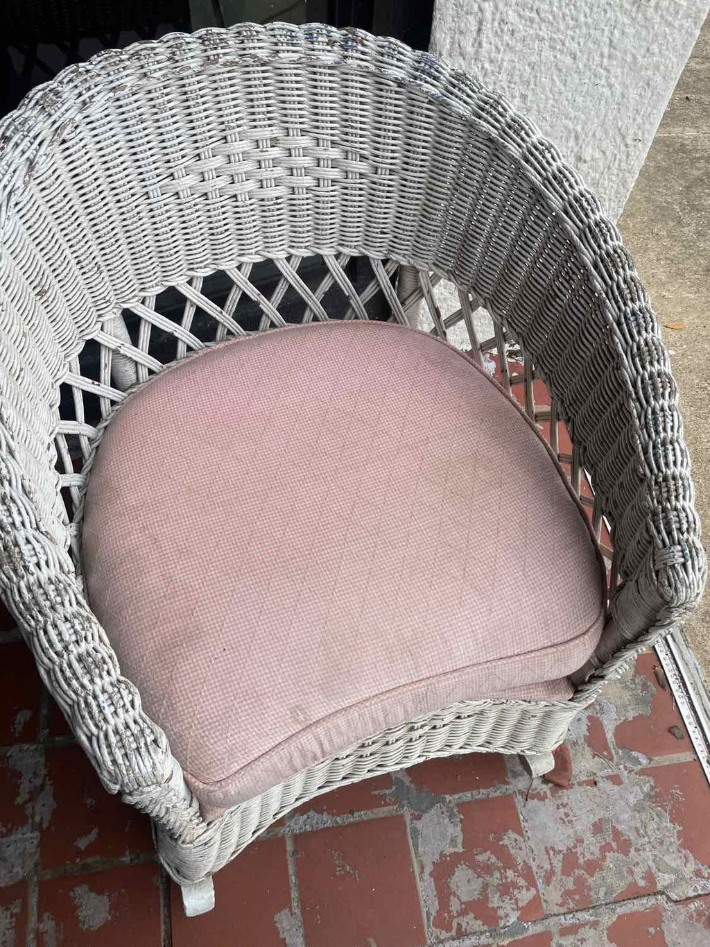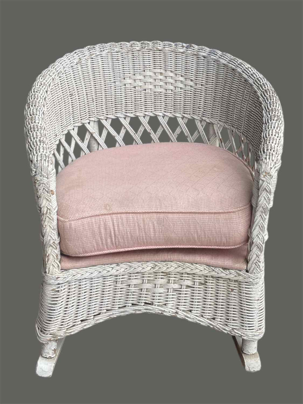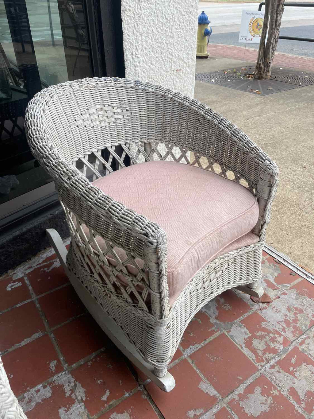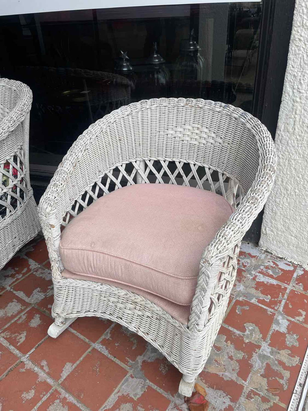 White Wicker Patio Rocking Chair W/ Pink & White Plaid Upholstered Seat - 27" Tall x 26" Wide x 27" Deep