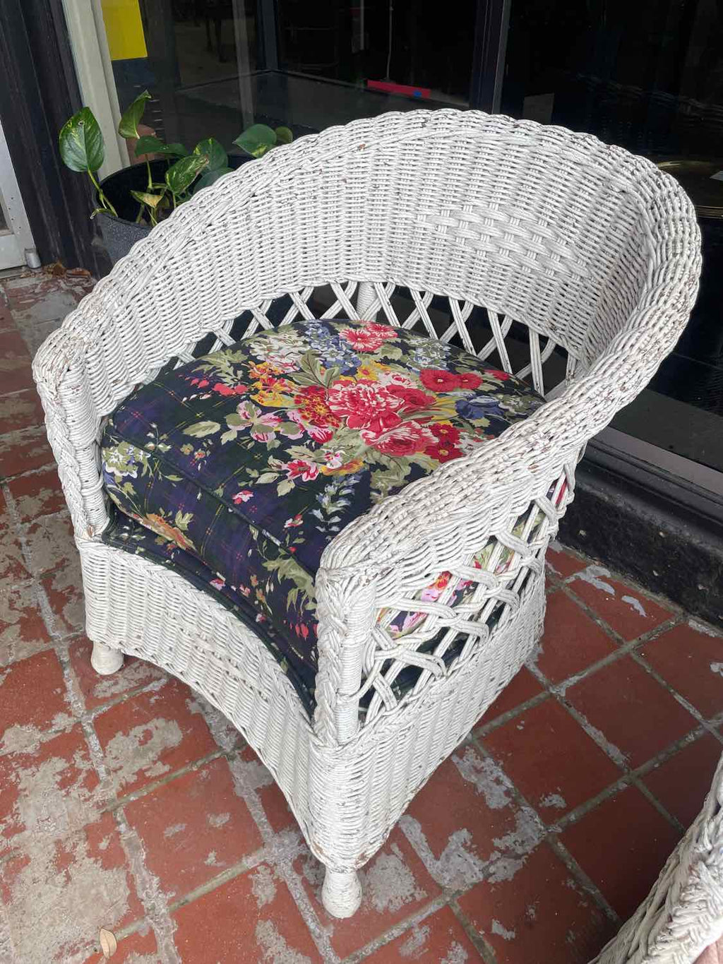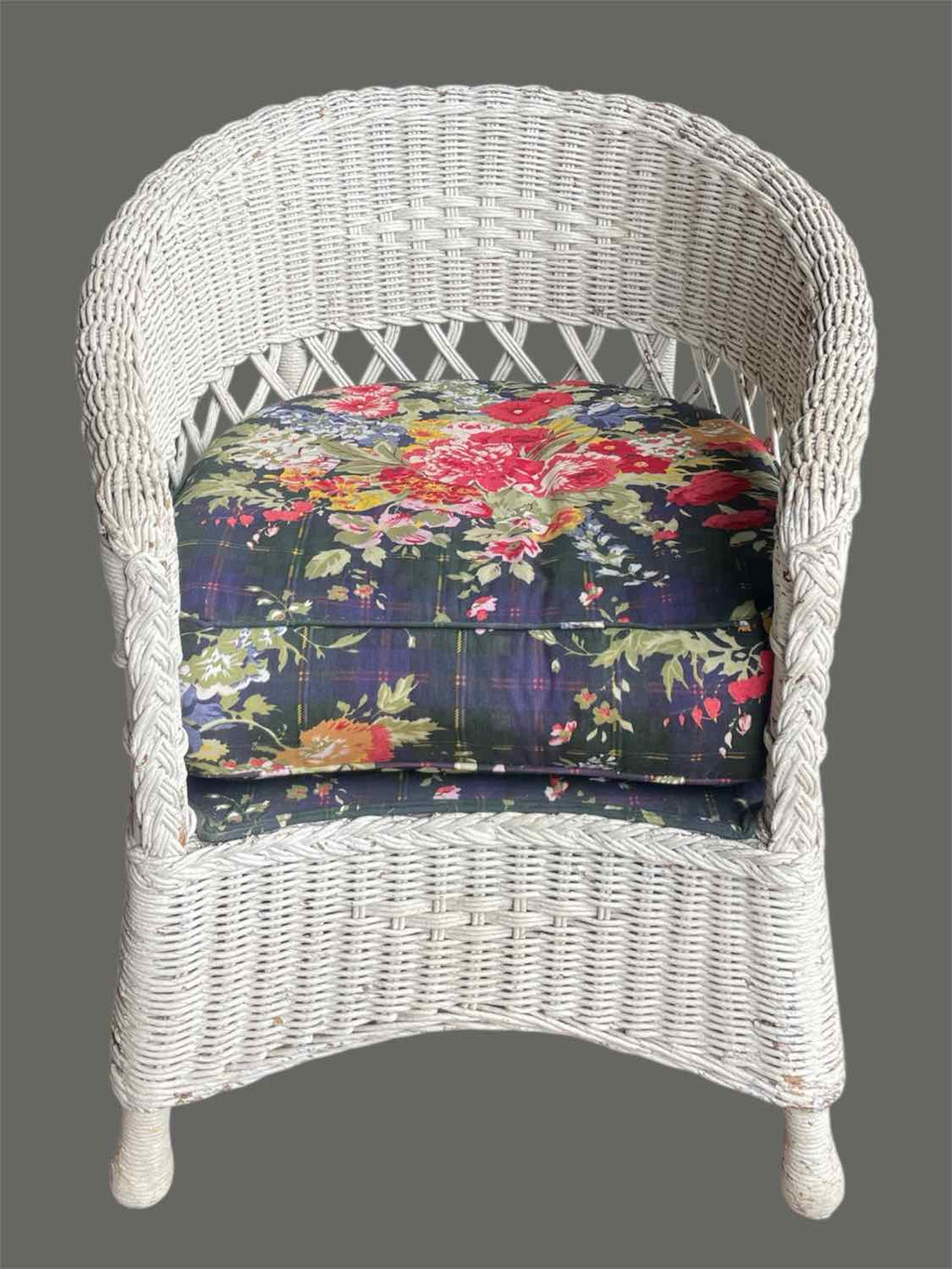White Wicker Patio Chair W/ Floral Upholstered Seat - 29" Tall x 26" Wide x 27" Deep