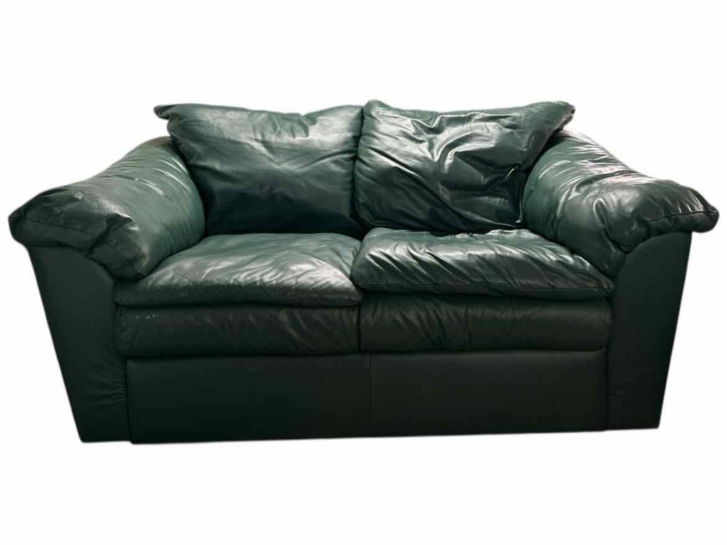 Green Leather Overstuffed Love Seat - 32" Tall x 66" Wide x 42" Deep